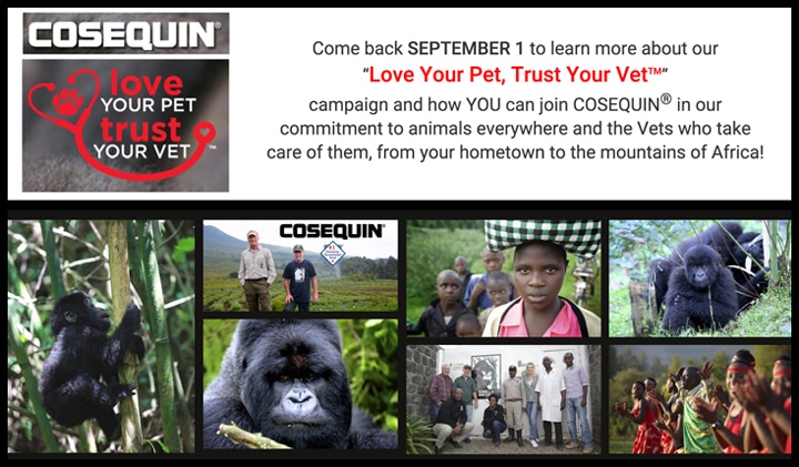 We are very pleased to announce that Cosequin will feature the work of Gorilla Doctors in their upcoming ‘Love Your Pet, Trust Your Vet’™ campaign! Manufactured by Nutramax, Cosequin is a nutritional supplement that helps domestic animals maintain healthy joints. With this campaign, Cosequin is celebrating veterinarians “who provide compassionate and quality health care” to animals around the world.