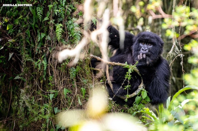 A mountain gorilla in Pablo group feeding in a tree. Volcanoes National Park. Photo by Skyler Bishop for Gorilla Doctors.