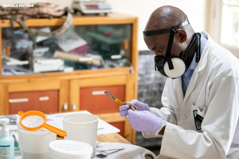Dr. Methode, Regional Laboratory Technician, prepares tissue samples for analysis. Photo by Skyler Bishop for Gorilla Doctors.