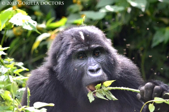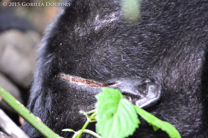 Dr. Ricky reports that twelve-year-old blackback Mukiza had four major wounds during his health check: a wound just above his right year, and others on his right forelimb, right thigh and right foot. The blackback is still feeding well and moving with the group, showing no signs of discomfort or illness.