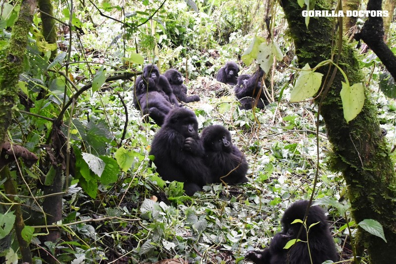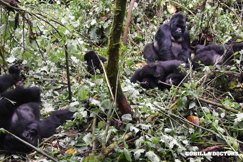 The mountain gorillas were resting and feeding, and the younger juveniles and infants were playing during their one-hour visit. Drs. Eddy and Martin observed a total of 37 gorillas during their health check, and all gorillas were physically healthy.