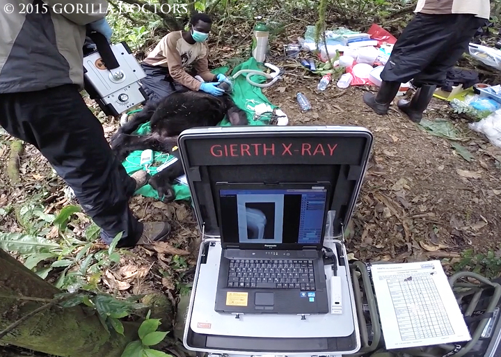 When Dr. Fred found the female in the forest, he confirmed that she was not bearing weight on her legs and had a wound on her right hip. Our Uganda Field Vet administered antibiotics via a dart and notified our Regional Manager, Dr. Joost Philippa, who crossed the border from Rwanda to Uganda with a newly acquired portable X Ray machine.
