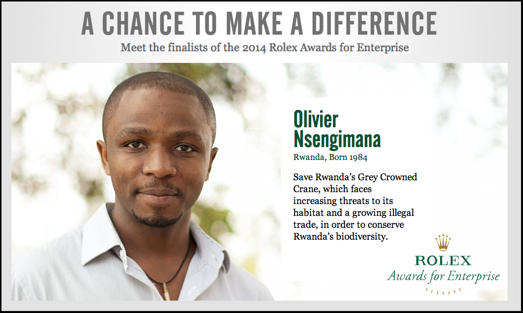 By Gorilla Doctors Staff on Monday, March 31st, 2014 in Archive, Blog, Leadership.Gorilla Doctors PREDICT Field Veterinarian in Rwanda, Dr. Olivier Nsengimana, has been named as one of 22 finalists for the 2014 ROLEX Enterprise Awards. The 22 finalists hail from 13 different countries and are in the running to win vital funding for their particular projects, as well as international acclaim as a 2014 ROLEX Young Laureate.