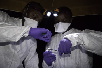 Drs. Julius Nziza and Olivier Nsengimana collect samples from bats.
