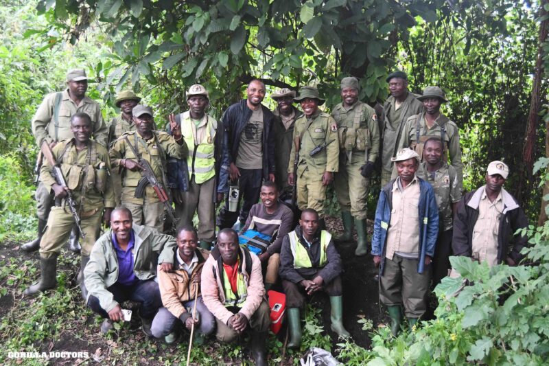 Dr. Fabrice and I immediately prepared our field medical kits and departed Goma around noon. Upon arriving at the park, we joined the intervention team (nine rangers, four trackers, seven porters) and trekked for about an hour before finding the group resting and feeding.