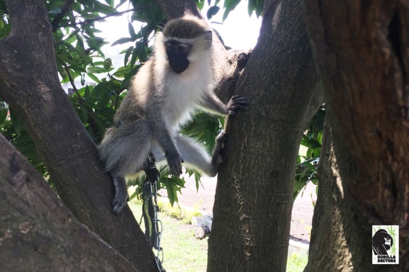 On February 2nd, the Chief Warden of ICCN notified Gorilla Doctors of a wild vervet monkey being kept illegally as a pet at a military compound near Goma. The following day, ICCN officials, joined by Gorilla Doctors Eddy and Martin, located the monkey at a home in the compound. The monkey was chained to a mango tree and showed no fear of humans, suggesting it had been in captivity for some time. The ICCN officials successfully confiscated the monkey and our Gorilla Doctors brought it to our compound in Goma for treatment.