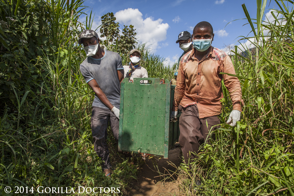 GRACE and Gorilla Doctors staff carry Ihirwe’s crate through the tall vegetation. Photo Credit: Marcus Westberg