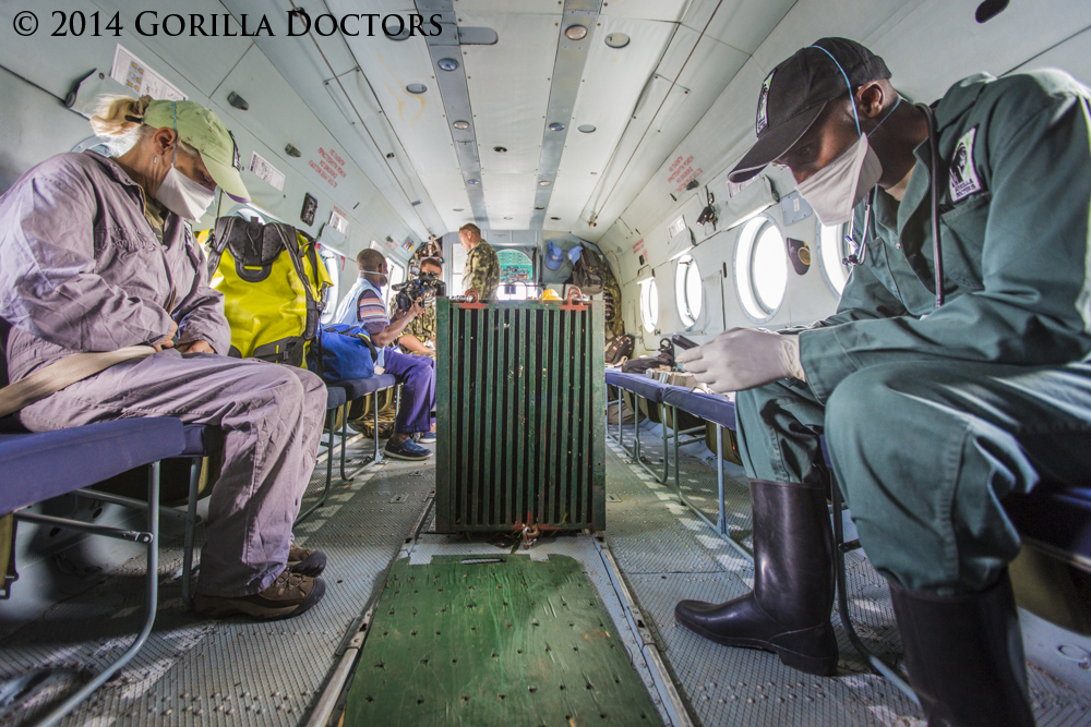 Once at the Goma airport, the Gorilla Doctors and Fossey Fund staff met with Yirga Huruy, the coordinator for the MONUC transportation. There were a few delays at the airport, but Yirga found a quiet place for Ihirwe to wait. Dr. Noel, Ihirwe’s primary veterinarian over the last 3 years, stayed with her for several hours, keeping her calm and feeding her bananas and water. Fortunately, she stayed relatively mellow throughout the transfer, and did not need to be sedated.