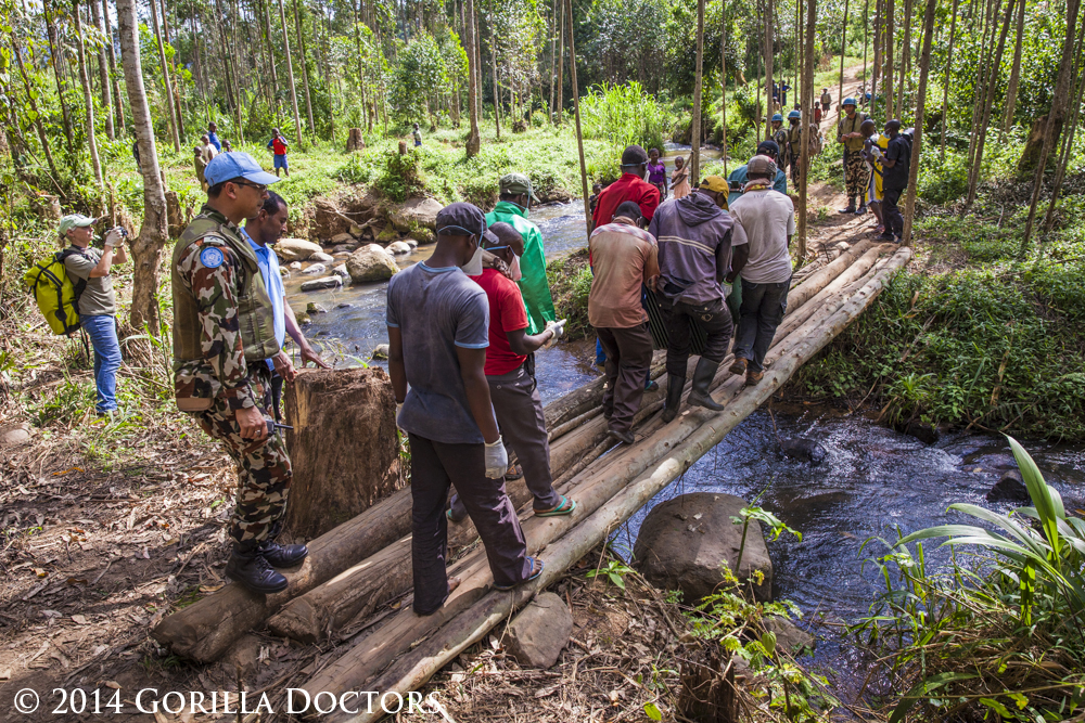 Staff carry Ihirwe across a bridge on the way from the helicopter to GRACE. Photo Credit: Marcus Westberg