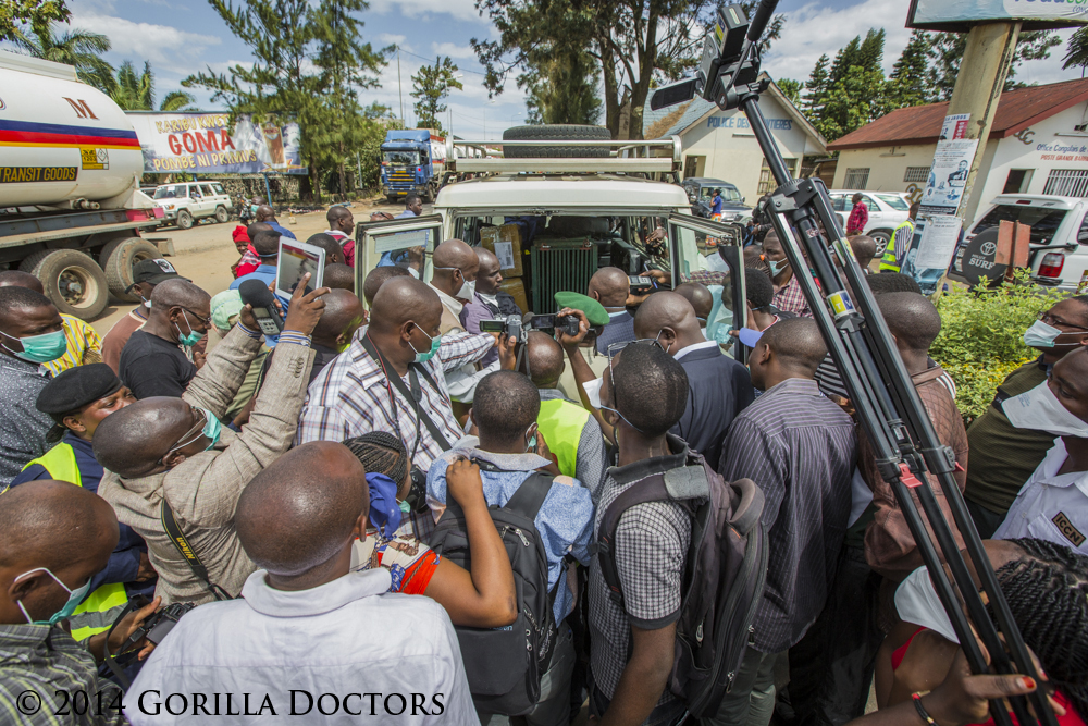 A large convoy comprised of staff from the Rwanda Development Board, the Dian Fossey Gorilla Fund International, and Gorilla Doctors made the one-hour drive to the Rwanda/DRC border. Still groggy from the anesthesia, Dr. Jan said that Ihirwe slept most of the way in the truck, but awoke at the border crossing as curious onlookers began to gather and try to snap photos. ICCN officials and local authorities were on top of crowd control though, and effectively dispersed the gathering people so as not to stress Ihirwe.