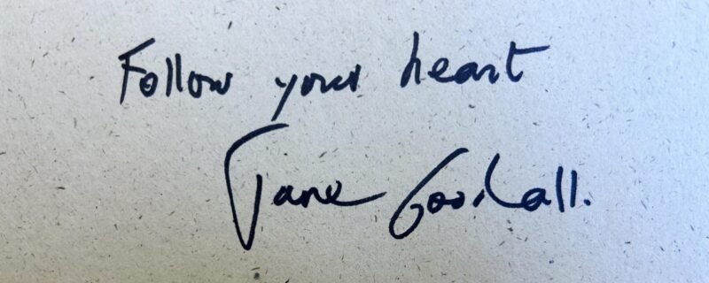It has taken me a couple days to gather my thoughts… I do not remember not knowing about Jane. Photographs in National Geographic and television documentaries of her with Gombe Stream chimpanzees fascinated me as a child. When I grew up, I wanted to be Jane Goodall (and oh by the way, until then, could I be her child Grub, who got to live in the field with her amongst the chimpanzees?) — I too wanted to study wild animals, and Jane made that seem eminently achievable. When I was 21, my parents gave me ‘The Chimpanzees of Gombe’ for Christmas. When I had the good fortune of meeting her a few decades later, she signed the book with: “Follow your heart”. When Jane Goodall tells you to do something, you do it!