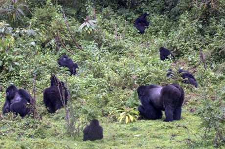 The trackers followed the trail and within 15 minutes we found gorillas! But it was Bwenge group, not Titus group! Jean spoke to the Bwenge trackers, and then we backtracked to the area of the night nests, picking up another trail. After about 30 minutes we ran into another group of trackers – they were looking for Isabakuru group. The tracks were cris-crossing and confusing that morning! The trail we were following turned out to be a dead end, so we turned around again. Then we got word on the radio from Bwenge group trackers that Titus group was very near Bwenge group. Good news. We headed that direction and finally met up with Rano and his group at 9:30.