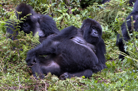 Once I’d seen everybody in Titus group I could not resist the opportunity to do a health check in Bwenge group. After all, they were only a stone’s throw away! So I left Jean and joined the Bwenge trackers and researchers. The group was in a small clearing eating, playing and resting. It was absolutely wonderful to watch such a content, healthy family group.